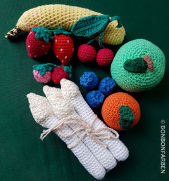 Die einzelnen Obst- und Gemüsesorten bestehen zu 100% aus Baumwolle und sind mit Bio-Baumwolle gefüllt, was eine gewisse Steifig- bzw. Festigkeit mit sich bringt.